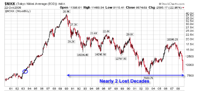 La massa di questo debito, che diventò per una buona porzione pubblico, (il debito Giapponese schizzò dal 50 al 170 % del PIL) creò l’humus, il terreno per una situazione di stagnazione economica, a lungo termine; ad oggi il perdurare della situazione configura quasi due decadi di questa stagnazione, come si evince dal grafico dell’indice Nikkei, più sotto riportato.