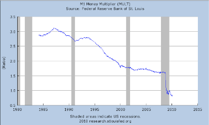 Il “Money Multiplier” (moltiplicatore della massa di denaro M1) è il processo tramite il quale, la moneta immessa nel sistema creditizio si moltiplica attraverso il sistema dei depositi. Questa dinamica si riferisce agli stati Uniti che comunque, nel bene e nel male sono stati senz’altro il modello trainante di economia di questi 10 anni;
